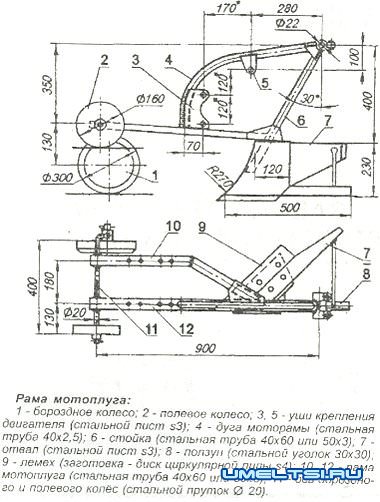 Основу такого мотоагрегата составляет плуг, сконструированный по типу классического, конного. У него - усиленная V-образная рама, сваренная из стальных труб прямоугольного сечения 40x60 мм (можно воспользоваться и круглыми с внешним диаметром 40-50 мм).