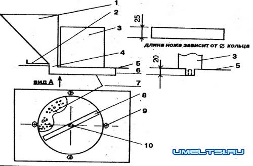 В металлическом листе ближе к электродвигателю просверлил отверстие диаметром 30 мм и закрепил бункер. Его можно сделать из жести или приспособить для этого пластмассовую канистру из-под масла или тосола. Для регулировки подачи зерна сделал задвижку.