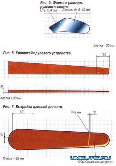 Лопасти и аэродинамический руль выпилены из фанеры толщиной 10 мм. Консоль кронштейна крепления пера руля при порывистом ветре испытывает большие нагрузки, и потому её изготовили из заготовки толщиной в 15 мм. Готовые лопасти и руль мы видим на фото 4. Выкройки этих деталей представлены на рис. 5-8. Хотя лопасти и имеют плоский профиль, но их кромки должны быть обработаны в соответствии с рисунками.