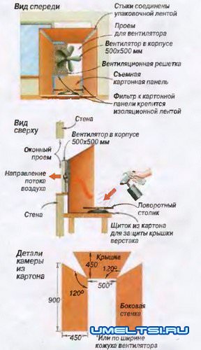 Имейте в виду, что пары краски и ее мельчайшие частицы при нанесении отделки на изделие попадают в окружающую атмосферу. Поэтому в мастерской во время этих работ стоит неприятный запах, а из-за попадания избытка краски на изделие его поверхность становится шероховатой. От всего этого вас и избавит камера, работающая по принципу аэродинамической трубы. В ней не попавшая на изделие краска выбрасывается вентилятором наружу, а мимо вас и изделия непрерывно проходит чистый воздух.