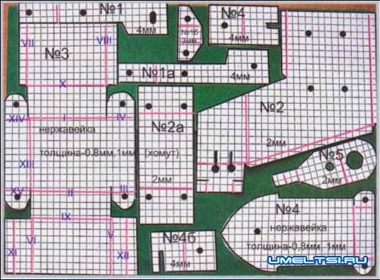 Детали №1 и 1а я вырезал из стального листа толщиной 4 мм, 16 —из листа толщиной 3 мм. Эти детали крепятся на шаровые краны вместо стандартных ручек (фото 2).