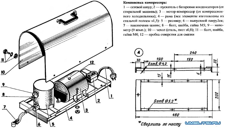 Такая же судьба постигла бы и мой немало послуживший, но еще работающий холодильник (умышленно не называю его марку, а почему — станет ясно из дальнейшего рассказа). Но мне под руку в это время попала вышедшая лет двадцать назад книга Д.А.Лепаева «Электрические приборы бытового назначения», в которой описывались различные «домашние» машины, в том числе и холодильники. В книге был приведен наглядный подетальный чертеж мотор-компрессора. Там же были приведены и мощностные данные компрессора. Создаваемое им давление 6— 10,5 атм. Это и натолкнуло меня на мысль сделать из этого агрегата бытовой домашне-гаражный компрессор, потребность в котором тоже была. С помощью этого же чертежа я определился и с технологией разборки агрегата. обходимость в ней возникла в связи с изменением системы и вида смазки узлов, так как в новых условиях работы мотор стал быстро и сильно греться, угрожая выйти из строя.