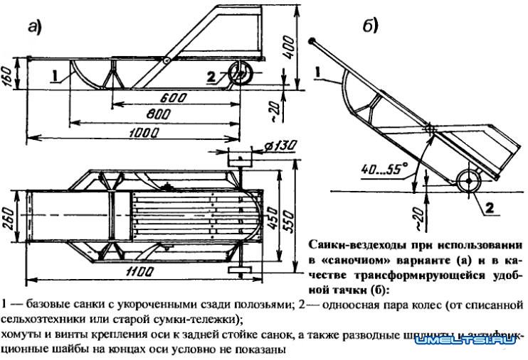 Детализация конструкции будет зависеть от ваших условий и технических возможностей, а также имеющейся материальной базы. Важен сам принцип доработки санок в универсальное и удобное транспортное средство, одинаково пригодное для эксплуатации в любое время года.
