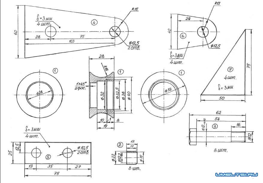 На представленных ниже чертежах, Вы увидите каждую деталь с размерами. Изготовить такую тележку Вам не составит особого труда, umeltsi.ru гарантируют, что будет сэкономлено много сил и нервов.