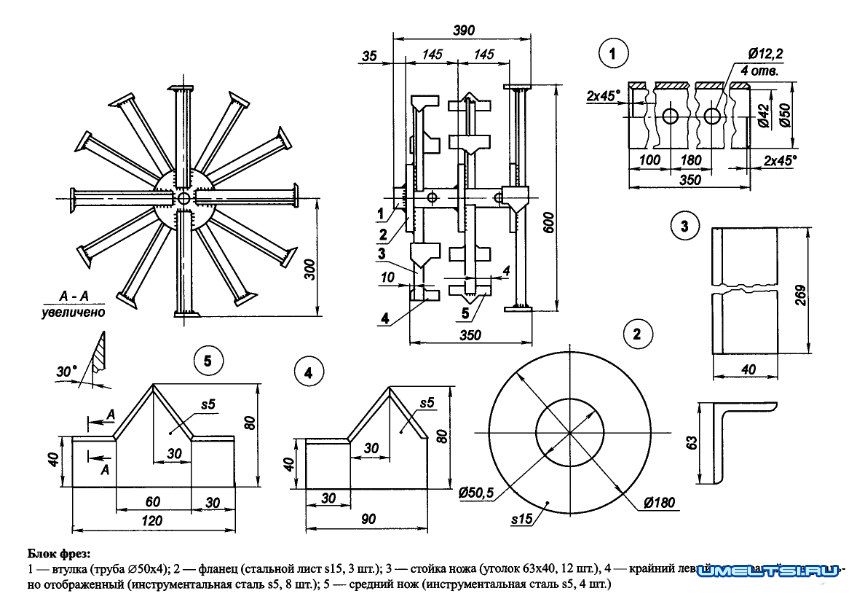 Фреза состоит из ножа, изготовленного из 5-мм листа инструментальной стали, и стойки, выполненной из стального уголка 63x40. Нож приварен к торцу стойки, а другой конец стойки приварен к фланцу, который и объединяет четыре фрезы, установленных взаимно перпендикулярно, в один узел. Фланец, в свою очередь, надет на втулку блока и приварен к ней по кругу.