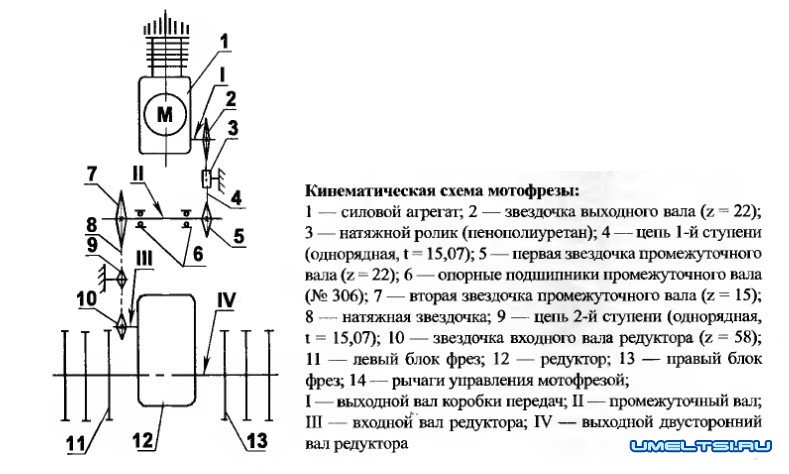 Трансмиссия мотоблока-культиватора скомбинирована из разных агрегатов промышленного изготовления и самодельных звеньев. Первая ее ступень — это сцепление и коробка перемены передач самого силового агрегата, вторая — самодельный промежуточный вал с двумя цепными передачами и, наконец, третья — понижающий редуктор.