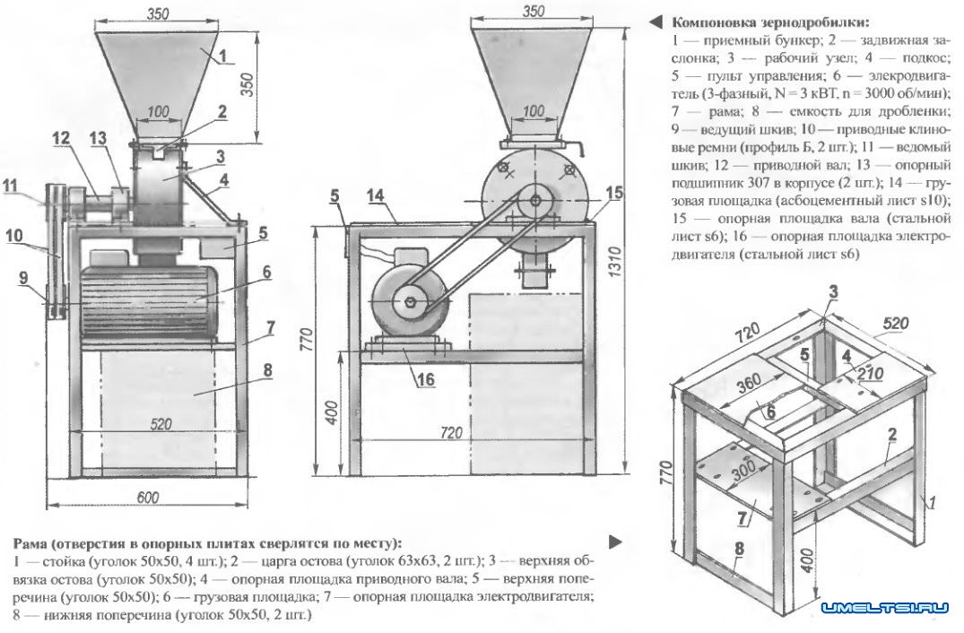 Конструкция зернодробилки, в общем-то, несложная, можно сказать, даже упрощенная. Все узлы и агрегаты смонтированы на простой прямоугольной раме, сварной остов которой большей частью выполнен из стального уголка 50x50 мм. Опорные площадки рамы: под электродвигатель и корпуса подшипников приводного вала изготовлены из стального 6-мм листа, а грузовая площадка-стол — из асбоцементного листа толщиной 10 мм.