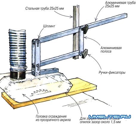 Ручка регулировки высоты сделана из алюминиевой трубы 25x25 мм и алюминиевой полосы шириной 25 мм. Для удержания головки на нужной высоте над столом служат зажимные ручки. Параллелограммный механизм удерживает головку горизонтально столу на любой высоте, и её можно легко поднять для замены диска или очистки стола. Чтобы отсоединить головку от механизма регулировки высоты, надо просто выдернуть два шплинта.
