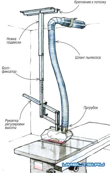 Ножка подвески сделана из стальных труб сечением 38x38 мм, 32x32 мм и 25x25 мм. Телескопически собранная ножка подвески позволяет грубо регулировать высоту подвеса головки и, при необходимости, быстро удалить весь блок защиты и пылесбора.