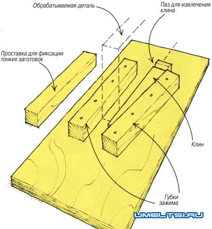 При работе с зажимом вставьте обрабатываемую деталь между губками и забейте клин. Чтобы освободить деталь, ударьте по пазу на толстом конце клина. Если надо закрепить тонкую деталь, достаточно добавить другую прокладку нужной толщины.
