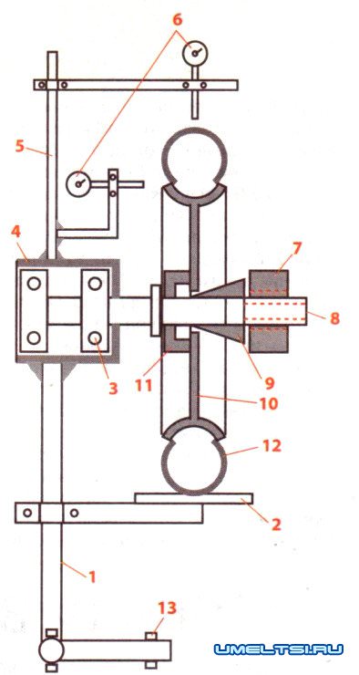1 — нижняя стойка, 2 — опорный столик, 3 — подшипники, 4 — корпус подшипников, 5 — индикаторная стойка, 6 — индикаторы, 7 — гайка, 8 — вал, 9 — конус, 10 — диск, 11 — упорная шайба, 12 — покрышка, 13 — регулировочные болты (по высоте)