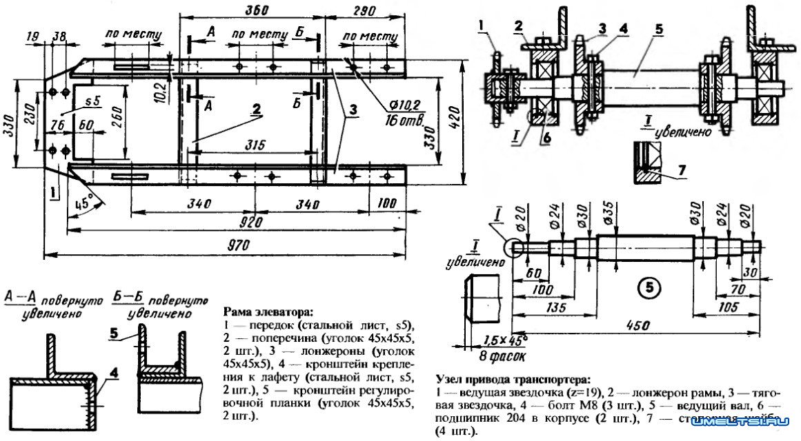 Рама элеватора сделана из уголков 45x45 мм. К ней привинчены лемех и корпуса опорных и тяговых звездочек на ведущем валу транспортера.