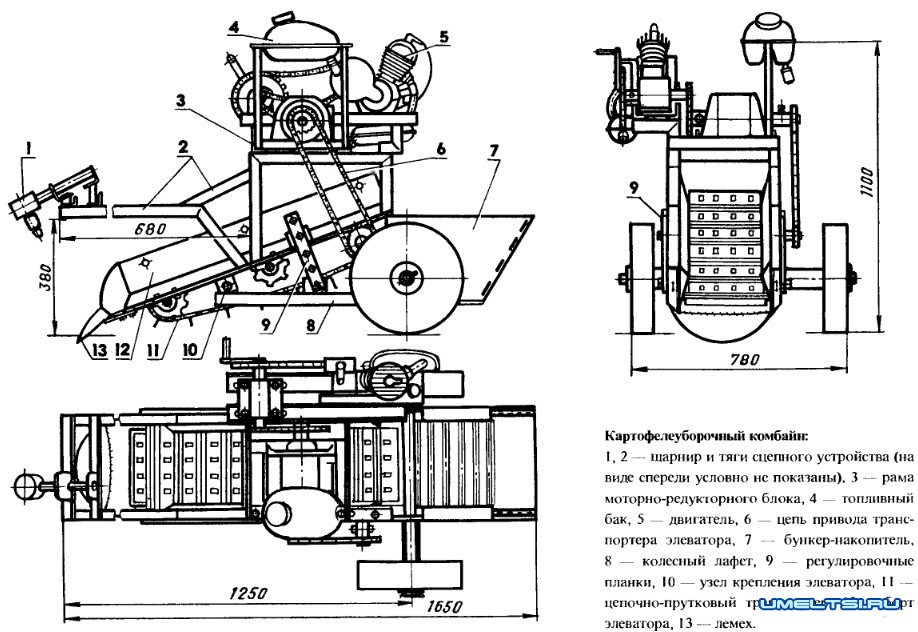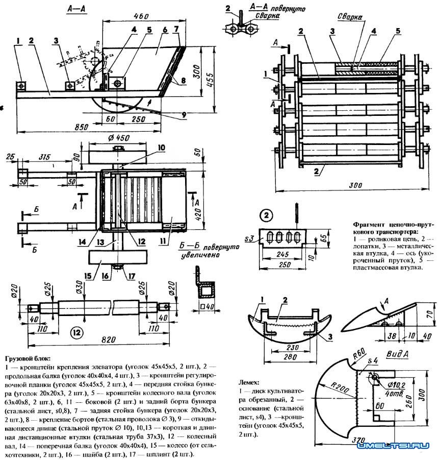 Комбайн прост конструктивно — в нем много узлов и деталей от списанных сельхозагрегатов, прежде всего от промышленной картофелекопалки, а также технологически — для его изготовления в домашней мастерской достаточно иметь ножовку по металлу, электродрель и сварочный аппарат (токарных работ здесь — минимум).