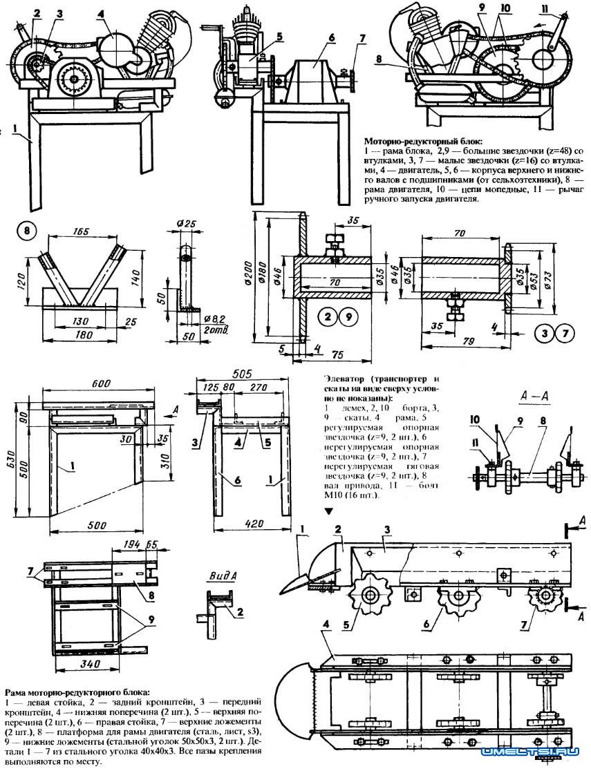 Как уже сказано выше, к элеватору крепится моторно-редукторный блок со своей рамой. Двигатель — мопедный, Д-6, без каких-либо доработок (хотя было бы полезно установить вентилятор принудительного охлаждения). Мощности его с лихвой хватает для привода транспортера. Заводится он самым простым способом — пусковым рычагом. Усилия руки для этого вполне достаточно.