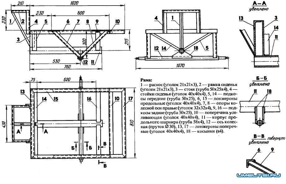 Рама изготовлена из набора стальных элементов: уголков, прутка, труб круглого и прямоугольного сечения. Они сварены в конструкцию, некоторая замысловатость которой обусловлена работой тележки на местности, изобилующей неровностями рельефа, россыпью камней и валунов: эксплуатационные нагрузки здесь очень велики.