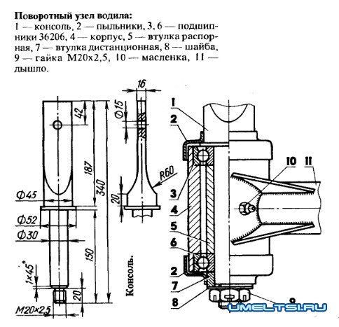 С мотоблоком тележка соединяется с помощью консоли, верхняя часть которой повторяет обводы держака того же окучника, поскольку вставляется в штатный кронштейн навесных орудий, а нижняя представляет собой ось, вокруг которой в двух радиально-упорных подшипниках вращается поворотный узел водила. Пространство между подшипниками заполнено консистентной смазкой и прикрыто пыльниками.