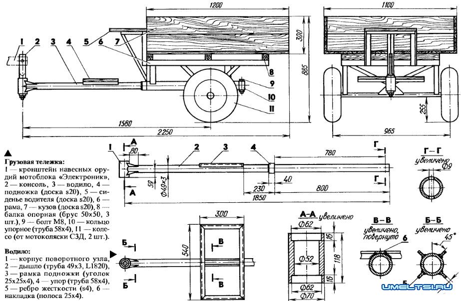Поскольку В.А.Свербиль использует свой мотоблок преимущественно для выращивания картофеля, то на грузовой тележке к мотоблоку перевозится в основном этот сельскохозяйственный продукт. И в довольно большом количестве: тележка вмещает шесть мешков картофеля, плюс вес водителя — итого около четырехсот килограммов. Отсюда конструктивные особенности тележки: прочное водило, мощная рама, вместительный кузов, надежные колеса. В такой последовательности и будут рассматриваться перечисленные узлы и агрегаты.