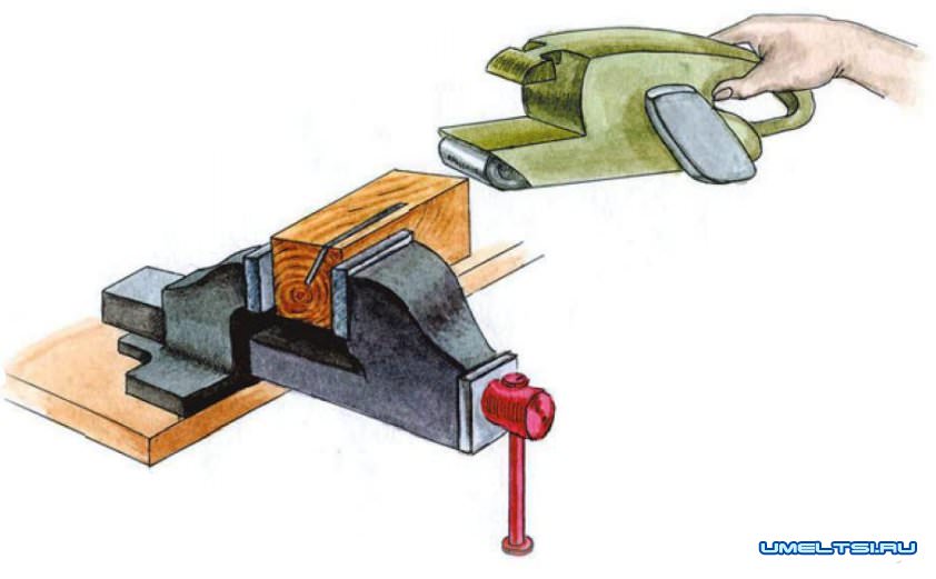 Для заточки оправку с ножом зажимаю в тисках и ленточной машинкой шлифую по длине ножа. Поверхность бруска помогает выдерживать правильное положение подошвы шлифмашинки относительно ножа. Заменой крупной шкурки на мелкозернистую достигается хорошее качество заточки. Эту процедуру можно делать и вручную, напильником сняв фаску а далее шливовальной бумагой.