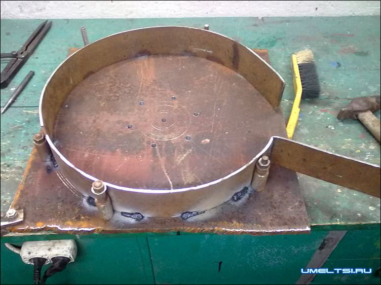 Можно сделать садовый измельчитель с электродвигателем, тогда и возни с измельчением будет меньше, но должно быть место для подключения, что проблематично в разных местах участка. В принципе, он нисколько не отличается от вышеописанного. Для такого измельчителя потребуется диск диаметром 20 миллиметров с тремя овальными отверстиями для последующего крепления ножек. Оптимальным будет двигатель в 3 кВт, но можно взять и помощнее. Диск можно разместить горизонтально, по желанию, можно установить и вертикально. Его еще называют измельчитель щепы.
