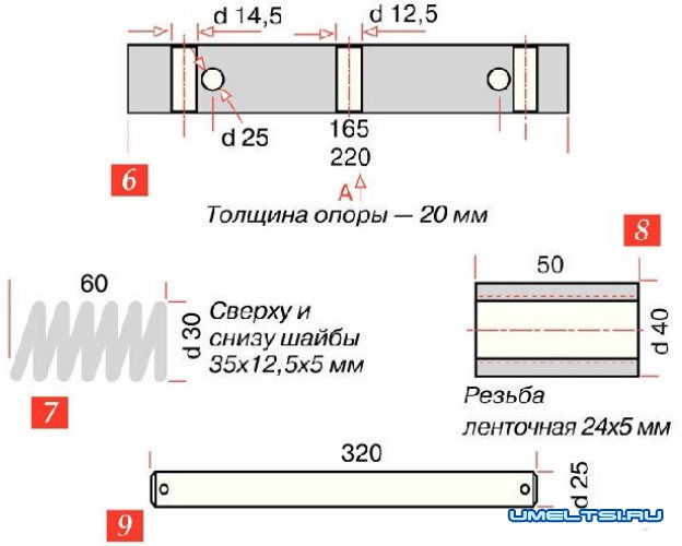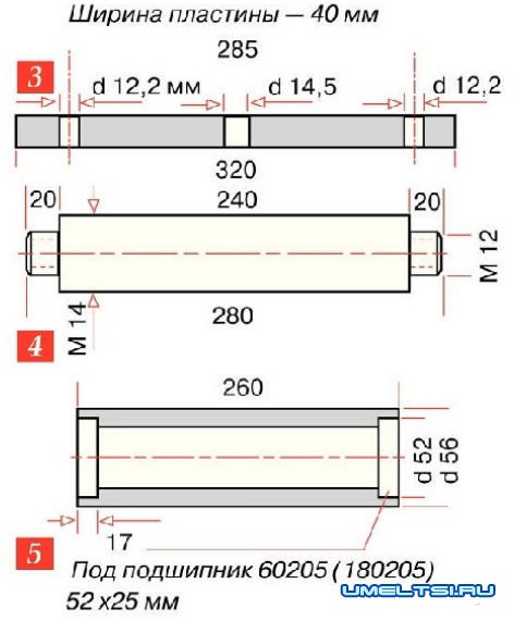 Деталь 5 (см. схему) можно изготовить из обрезанных отжимных валиков стиральной машины («Рига» и т.п.). В этом случае оси не нужны.