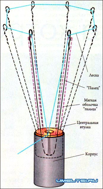 Рассмотрим инструмент поближе. Захват из восьми упругих «пальцев» с витыми кольцами сверху, одетых в мягкие оболочки из ПВХ- или подобных трубок, закреплённых в корпусе-обойме путём опрессовки на втулке. И самое интересное - привод. Через верхние кольца пропущена леска, соединённая с тягой обычным шнуром.