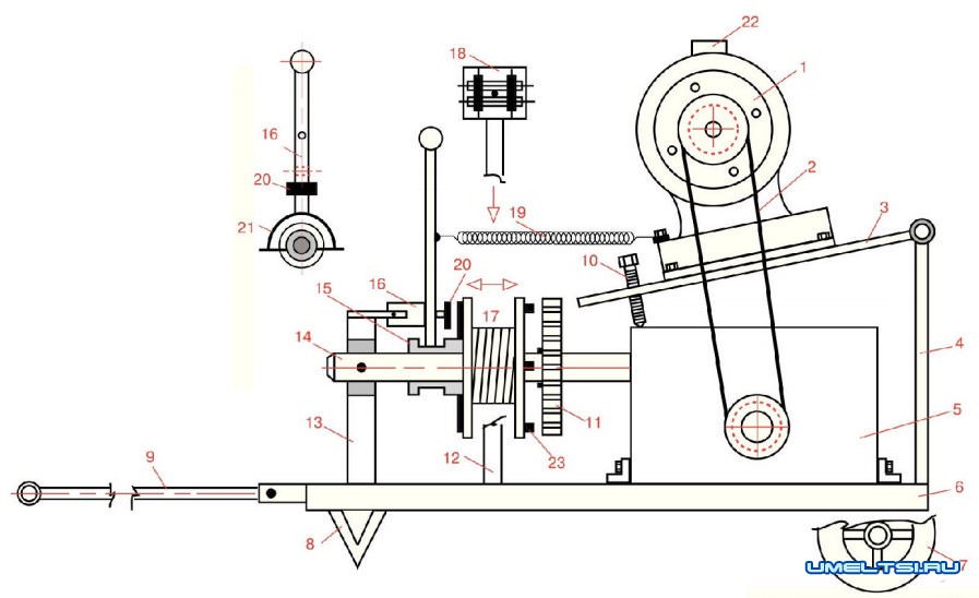 - 1. Эл.двигатель, 2. Ременная передача, 3. Основание-маятник, 4. Стойка маятника, 5. Понижающий редуктор, 6. Шасси (угольники 40x40), 7. Опорные колеса, 8. Якорь, 9. Ручка для вращения лебедки, 10. Винт натяжения ремня, 11. Шестерня привода, 12. Стойка крепления роликов, 13. Опорная стойка вала барабана, 14. Неподвижный вал барабана, 15. Подвижная муфта включения барабана, 16. Рычаг включения барабана, 17. Барабан с тросом, 18. Направляющие ролики троса, 19. Пружина, удерживающая рычаг включенным, 20. Тормозная накладка рычага, 21. Вилка включения муфты, 22. Кнопки управления, 23. Выступы барабана (шаг рассчитан в соответствии с шагом звездочки).
