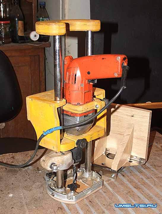 В основе этого приспособления площадка от старого, сгоревшего ручного фрезера. В чем ее преимущество: площадка ровная, имеет свои направляющие (они были заменены на более длинные трубки).