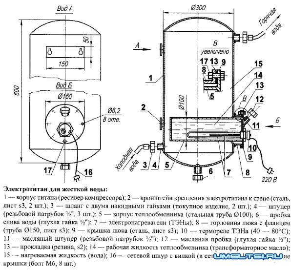 Корпус электротитана можно подобрать подходящий (например, от ресивера компрессора) или сварить из отрезка стальной трубы диаметром 300 — 400 мм. Изнутри корпус не нужно даже красить — совсем скоро его внутренняя поверхность покроется слоем накипи и не будет ржаветь.