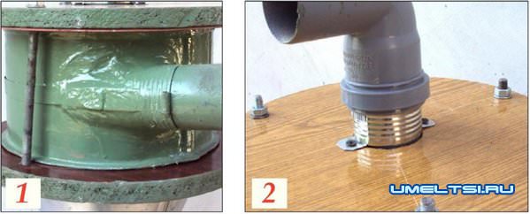 Все соединения в циклоне выполнил снаружи, все швы обработал герметиком. Устройство работает совместно с пылесосом. От циклона сверху к пылесосу подсоединяю гибкий гофрированный шланг, а сбоку другой — для приема мусора.