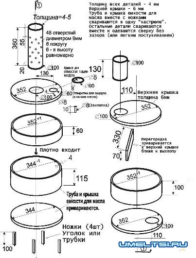 На схеме указаны размеры необходимых деталей для создания печки-буржуйки на отработанном масле
