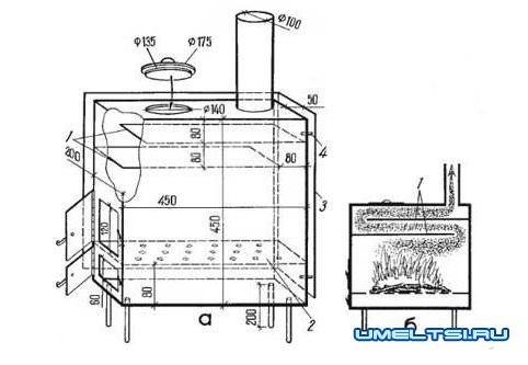 На другом чертеже начерчено более сложная конструкция буржуйки. Ее преимущество в том, что она может сохранять тепло на более длительный срок.