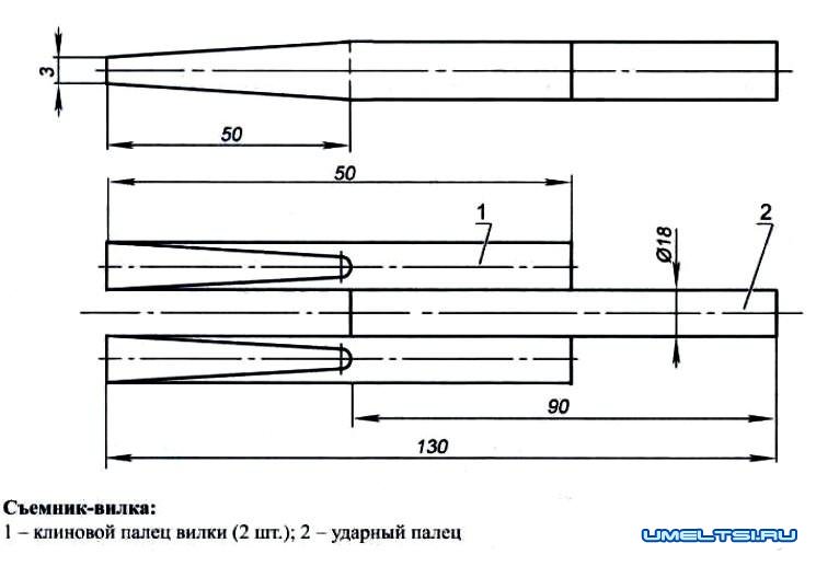 Материал: стальной пруток диаметром 18 мм. Съемник сварен из трех деталей в виде вилки.
