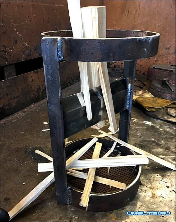 Конструкция данного дровокола (колуна) достаточно проста. Ее составляет арматура из стали высотой 50–60 см, с квадратом в верхней части. Посередине размещено лезвие полукруглой формы из 8–10 мм стали, которое и расщепляет поленья. Основная часть конструкции опирается на две вертикальные стойки, нижняя часть – с приваренными четырьмя распорками.