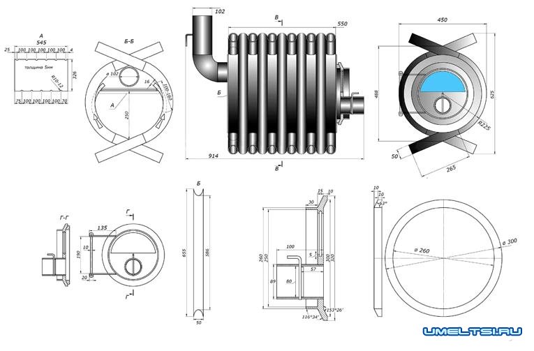 Чтобы самостоятельно соорудить конструкцию булерьян своими силами, нужно воспользоваться чертежами. По ним все элементы конструкции должны быть выполнены со строгим соблюдением всех размеров, с точностью до миллиметра. Лишь тогда во время сваривания конструкции в единый блок она не выйдет с перекосами. Чертежи печи булерьян вообще не так просто найти, однако их можно взять, посетив наш сайт.