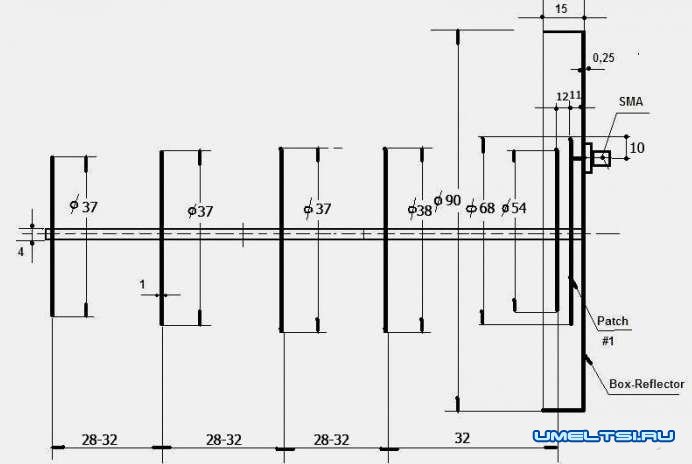 Вырезая окружность, следуем размерам, которые указаны на схеме, и вырезаем диски. Нужно делать все точно, с отклонениями хотя бы на миллиметр работа антенны будет значительно хуже.