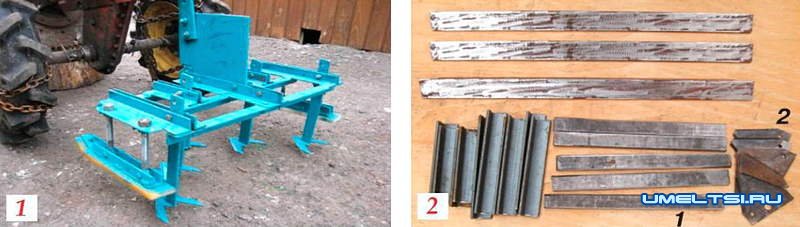 К торцу каждой пластины приварил перпендикулярно по ножу. В последних вырезал сегмент для облегчения врезания в землю (см. рис.), чтобы получился ласточкин хвост.