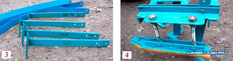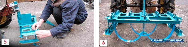 Готовую раму Владимир фиксирует на мотоблоке и закрепляет на ней лыжи и стойки-плоскорезы (фото 5). Отрегулировав все узлы по высоте, приступает к обработке почвы.