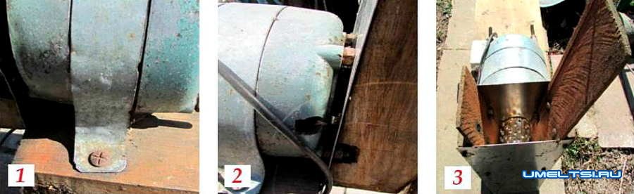 Из листовой нержавеющей стали вырезал две одинаковые заготовки в виде трапеций. Кромки каждой обработал напильником. В одной заготовке, отступив от вершины примерно 15 см, просверлил отверстие, диаметром чуть больше диаметра вала двигателя. Готовую деталь гайками прикрутил к мотору (фото 2) вершиной вниз.