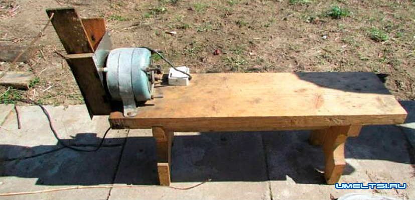 Электродвигатель от старой стиральной машинки закрепил на краю небольшой скамейки, используя винты и полосу жести (фото 1).