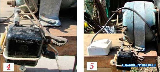Чтобы приспособлением было удобно пользоваться, дополнил двигатель включателем. К проводам мотора подсоединил сначала пускозащитное реле (фото 4), затем к контактам последнего подключил через обычный включатель (фото 5) провод с вилкой.