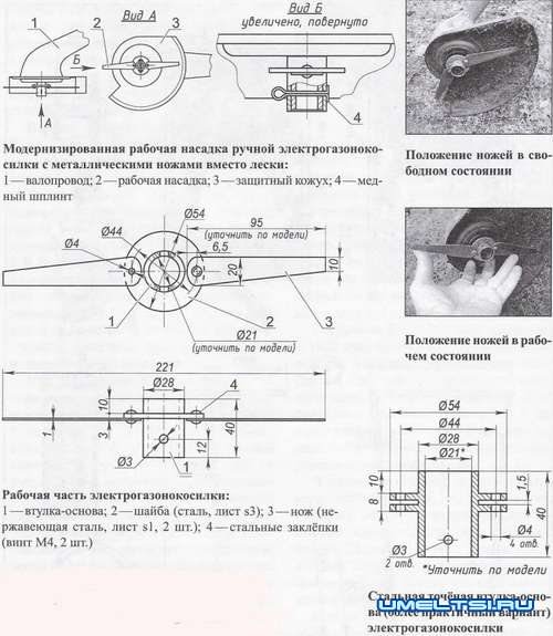 Модернизированная рабочая насадка ручной электрогазонокосилки с металлическими ножами вместо лески