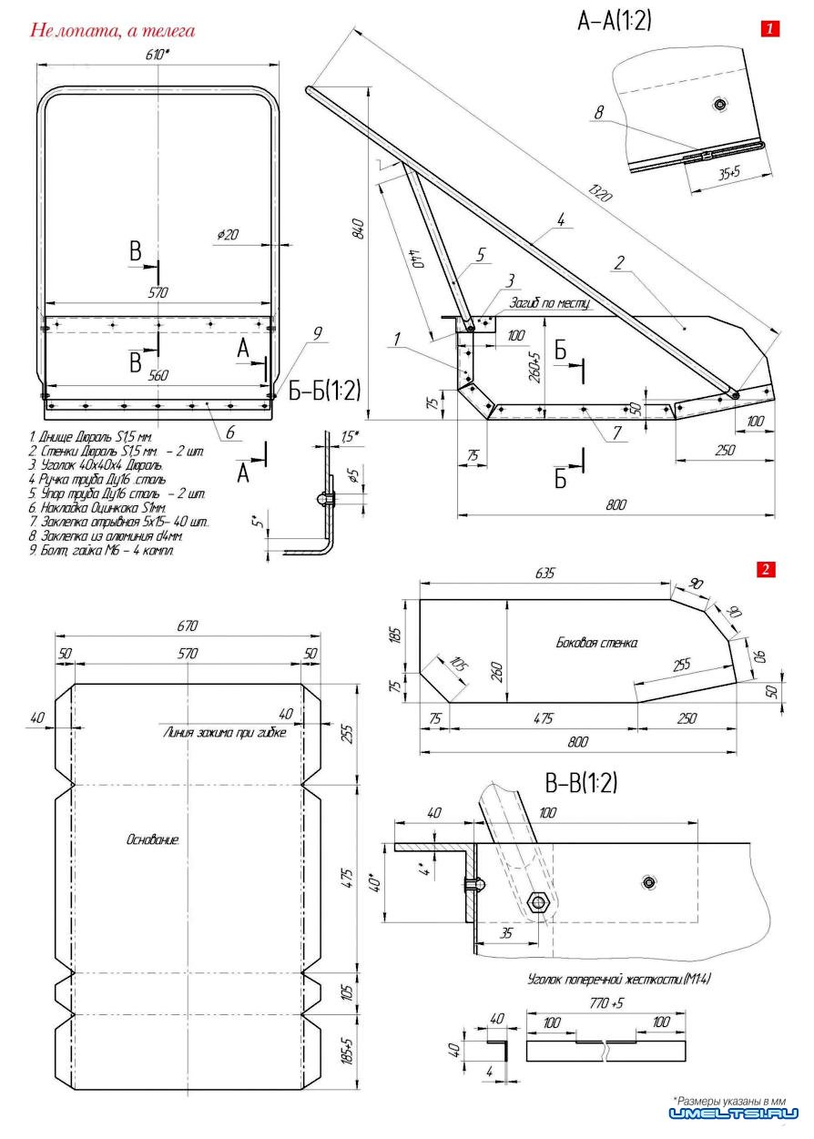 Лопату для соседки мастерил по ее эскизу, по нему же подготовил чертежи конструкции и отдельных ее элементов (развертка дна ковша и крепление рамы ручки) для себя (см. рис. 1, 2).