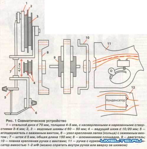 Машинку я сделал из мотора от старого проигрывателя, имеющего со стороны шкива алюминиевую площадку. На ней, убрав все лишнее, разместил нужные детали. Использую самые разные нитки и шерстяную пряжу по любой ткани, вплоть до тонкого брезента и джинсовки, за исключением трикотажа и ему подобного. Очень подходит ткань бортовка. Небольшие вещи вышиваю на пяльцах. Для более крупных вышивок нужны рамки соответствующего размера. Ткань набиваю с натяжкой вдоль и поперек. Наношу рисунок, лицевая сторона вышивки получается внутри рамки.