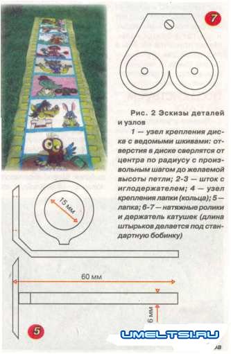 Важное преимущество предлагаемой разработки по сравнению с вышивкой ручной иглой в том, что нет необходимости промазывать изнанку ткани клеем БФ. Мои вышивки и спустя десятилетия не нуждаются ни в каком ремонте, лишь немного выцветают со временем.В качестве одного из самых интересных примеров своей работы привожу половичок «Сказочная дорожка» размером 6x0,9 м. Вышил его за восемь дней, без подклейки, лишь переколачивая рамку.