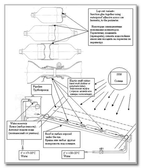 Я спроектировал, сделал (на кухне) и использую, примитивный, надежный, дешевый солнечный коллектор (из пластмассовых бутылок и их сегментов) для нагревания какой-либо среды, в большей степени воды.
