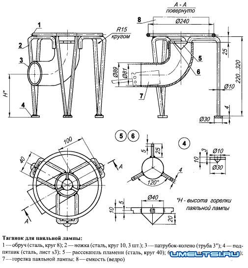 Паяльная лампа как нагревательный прибор с давних пор заняла место в наборе инструментов как у профессионалов, так и у многих любителей-конструкторов, поскольку топливом для нее служит всегда имеющийся под рукой бензин. Находит она разнообразное применение также и в хозяйственной практике сельских жителей и дачников в определенных ситуациях: очень выручает своих владельцев, например, когда надо быстро вскипятить воды, «прокалить» или нагреть металл, во многих других случаях. Одно плохо: этой лампой не всегда удобно пользоваться—например, нельзя направить пламя вверх, что бывает нужно довольно часто. Чтобы устранить этот недостаток, лампу можно снабдить дополнительным приспособлением—подставкой-таганком с загнутым вверх патрубком-коленом.