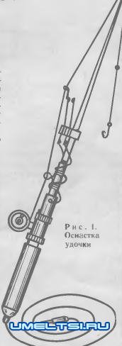Принцип действия индикатора прост. На удилище в непосредственной близости от катушки крепится датчик (рис. I), который при поклевке от натяжения лесы замыкает контактную пару, включающую питание электронного устройства,— загорается соответствующая лампа, и одновременно подается звуковой сигнал.