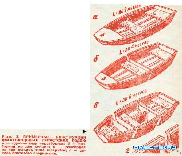 Так на каком же типе лодок остановиться? Это зависит от тех целей и задач, которые ставит перед собой строитель. Например, для охоты и рыбалки наиболее подходящими будут двухтранцевые конструкции, вроде «Золотой рыбки», «Бемби» и им подобных (рис. 2). Они разбираются на две или три секции; трехсекционные лодки (при условии, что они вкладываются одна в другую, как матрешки) можно перевозить не только а стандартном контейнере, но в багажнике легкового автомобиля или на мотоцикле с коляской. Целесообразно изготовлять секции таким образом, чтобы каждая из них обладала автономной плавучестью; для этого необходимы глухие перегородки (диафрагмы) по разъемам (рис. 3).