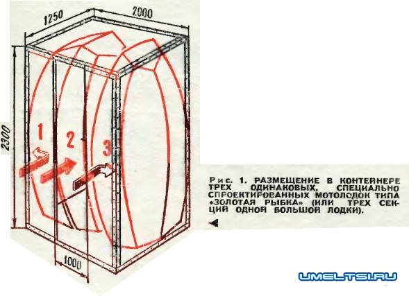 На рисунке 1 изображен стандартный контейнер и приведены его размеры. Они являются основой при выборе проекта лодки и разработке конструкции. Опыт эксплуатации разборных лодок показал, что постройка таких судов посильна любителю средней квалификации, если их размеренна укладываются в приведенную таблицу. При создании разборной лодки больших размеров могут встретиться серьезные трудности. К тому же в любительской практике такая лодка по ряду соображений просто неудобна: вместо одной большой лучше иметь две-три маленькие, более транспортабельные и маневренные. Впрочем, можно сказать с полной уверенностью, что на сегодняшний день даже в любительских условиях вполне реально создание полноценной разборной мотолодки или швертбота длиной до 5—6 м.