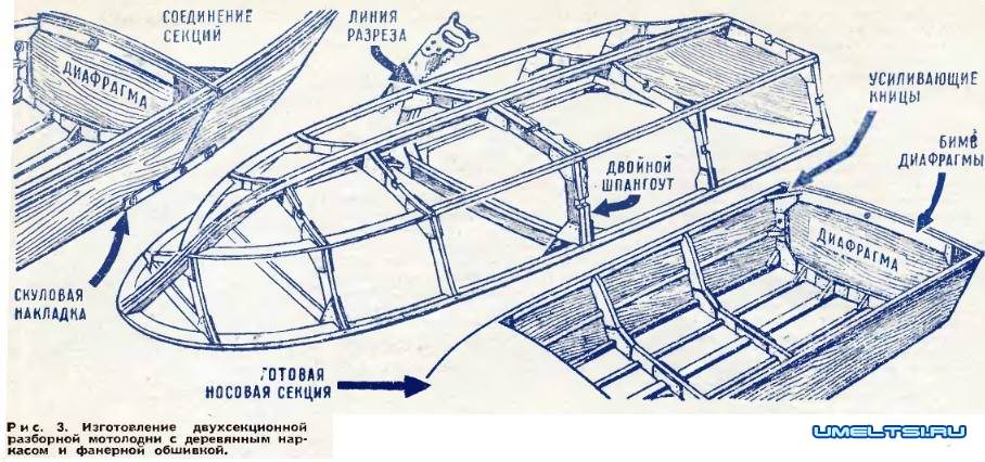 В персом случае (деревянный вариант) корпус строится, как обычно, целиком, но после обшивки фанерой аккуратно распиливается на предусмотренное количество секций, а затем выполняется заделка диафрагм, оклейка стеклотканью (или хлопчатобумажной бязью) и монтаж болтового соединения.